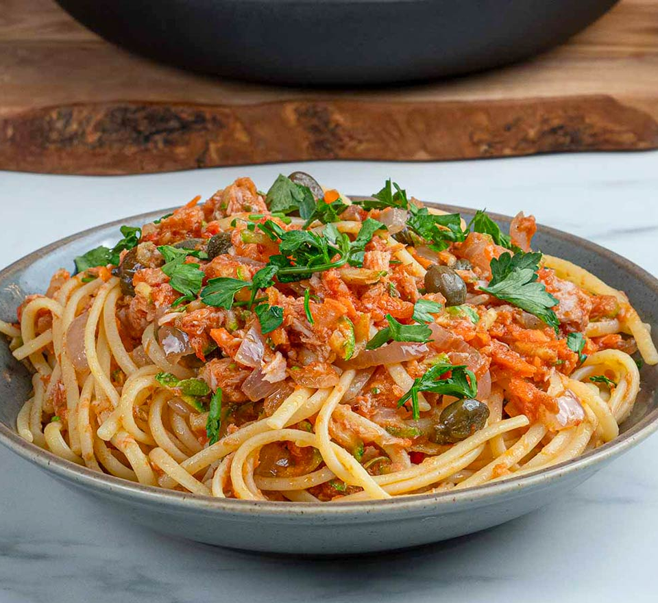 - Στραγγίζουμε τον τόνο από το υγρό του, τον λιώνουμε με πιρούνι και τον προσθέτουμε στη σάλτσα.